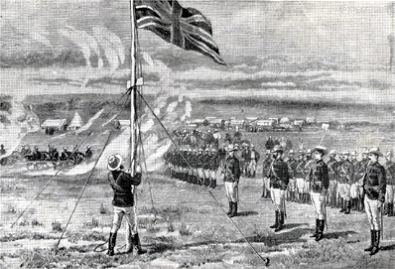 The Pioneer Column raises The Union Jack on the kopje over looking Fort Salisbury