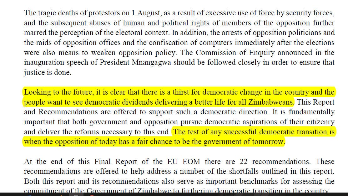The European Union Election Observer Mission presented its final report on the Zimbabwe July 30th harmonised elections… and their verdict is although the elections were largely peaceful and markedly improved from previous electoral processes, they did not quite meet the standards…..