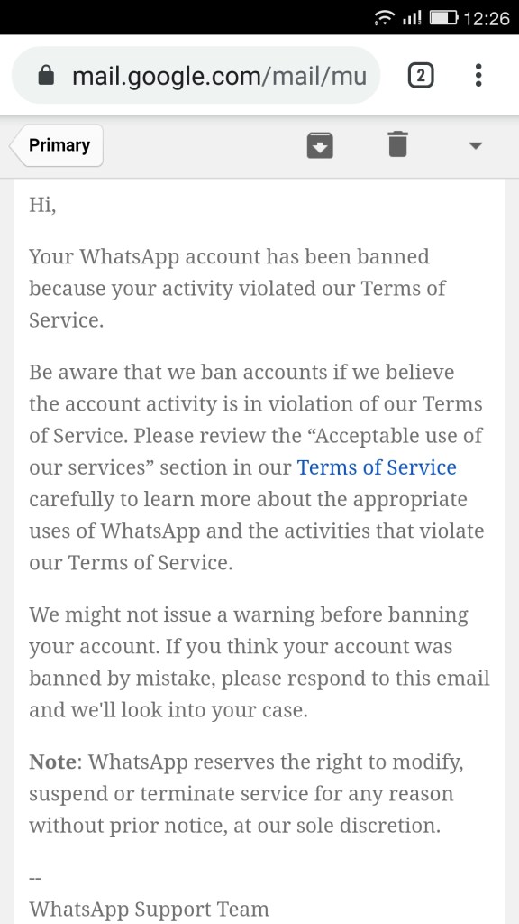 Several hours later a reply popped through citing rather vaguely  that I had been in violation of WhatsApp’s terms and conditions
