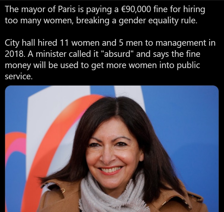 Speaking of questionable rulings did you hear about the Paris Mayor who was fined for hiring more women than men and the fine would be used to get more women into public office… wait what?