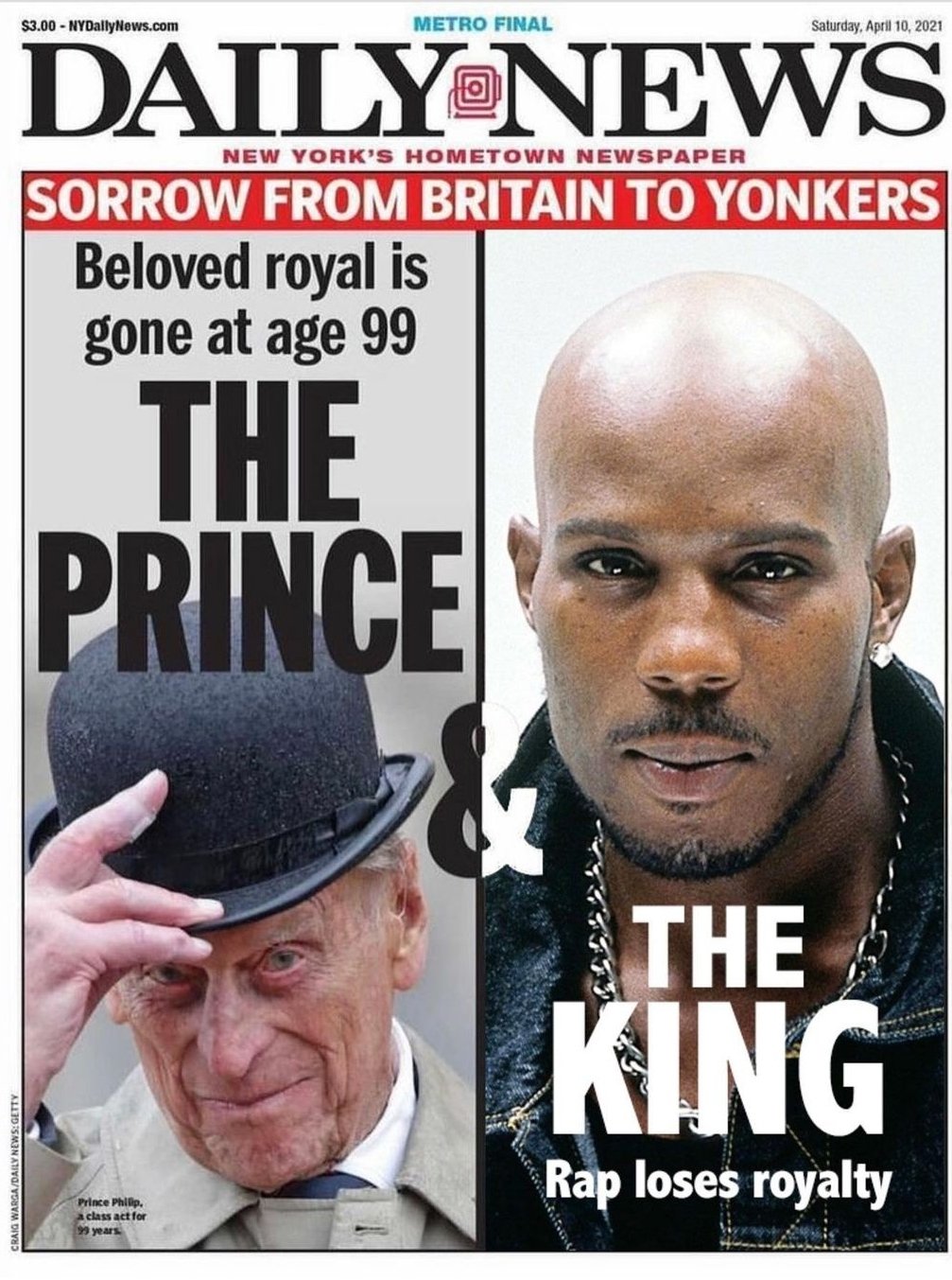 The New York Daily News carried the headline The Prince and The Rapper and ran articles on the death of Prince Philip (99) and Rapper DMX (50).