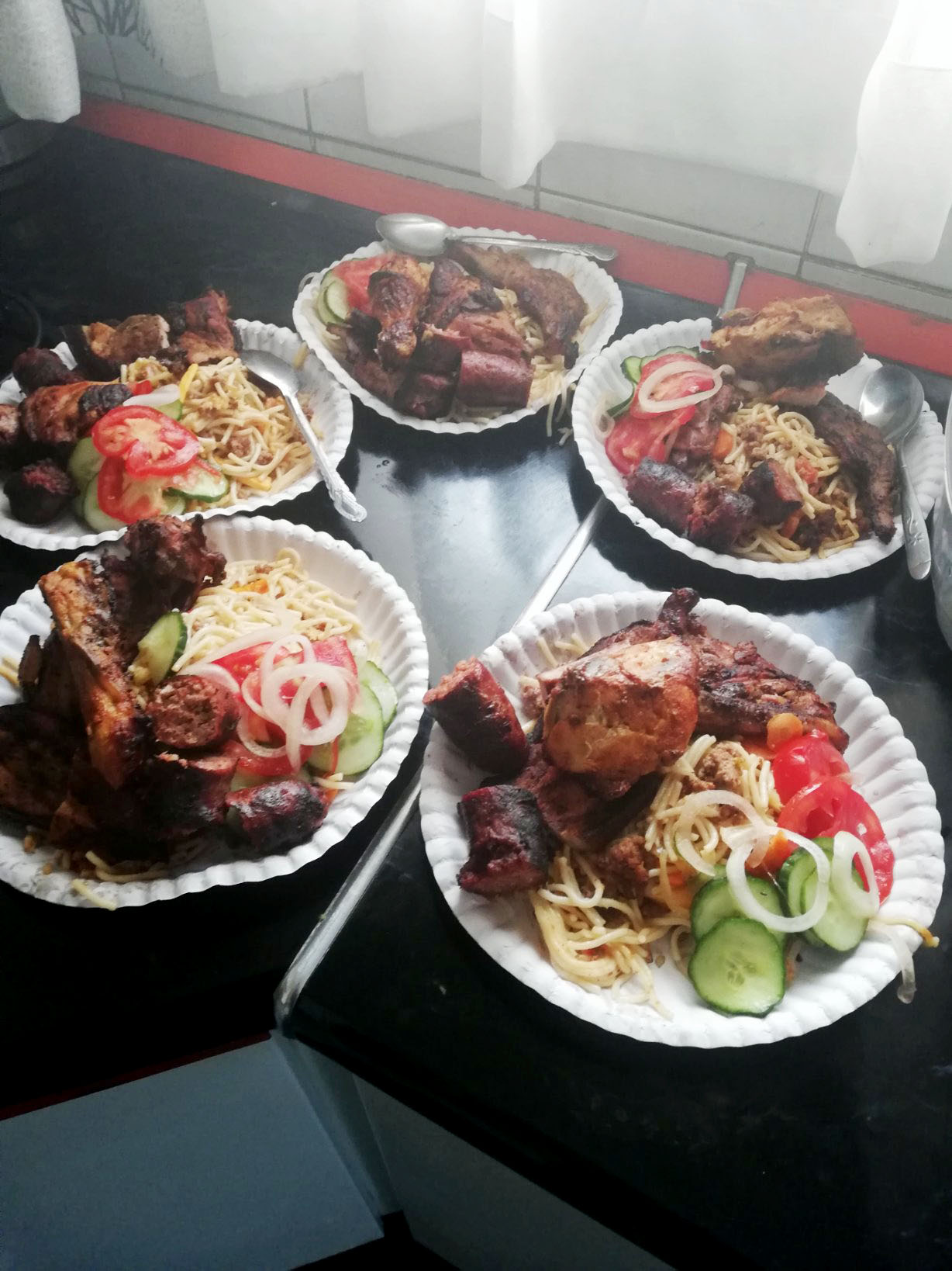 A pasta with three-tier cheese served with marinated, flame-grilled mixed barbecue, cucumber, onion and tomato salad , conveyed in paper plates.