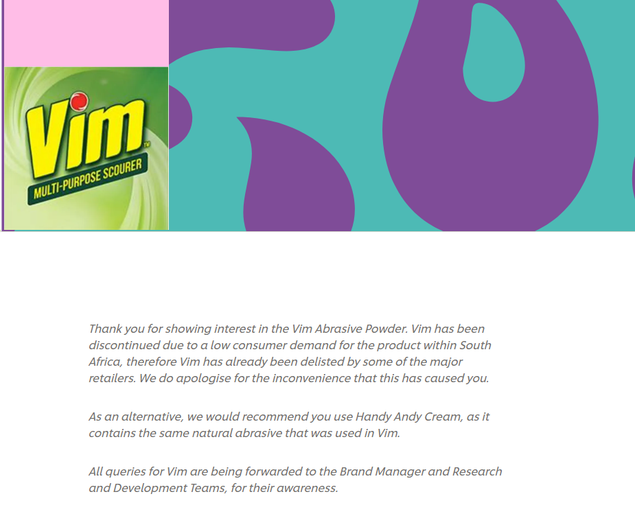 Unilever South Africa posted a notice that they would be discontinuing Vim Abrasive Powder due to low consumer demand for the product within South Africa. Unilever Zimbabwe has over the years descaled manufacture in Zimbabwe in favour of outsourcing from South Africa so this would translate to Vim no longer being available in Zimbabwe as well. Feels like the end of an era.