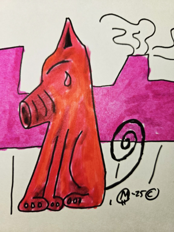 I did painting sort of like the drawing above, except it was painted in acrylics with different shades of red. I called it “Depressed Pig” it was an animal interpretation of me at the time. At a showing of it on exhibit I overheard one woman explain to another what the artist was trying to convey. She said “It’s pretty obvious that the artist is vegan and this painting is a statement on how cruel meat farming is.”